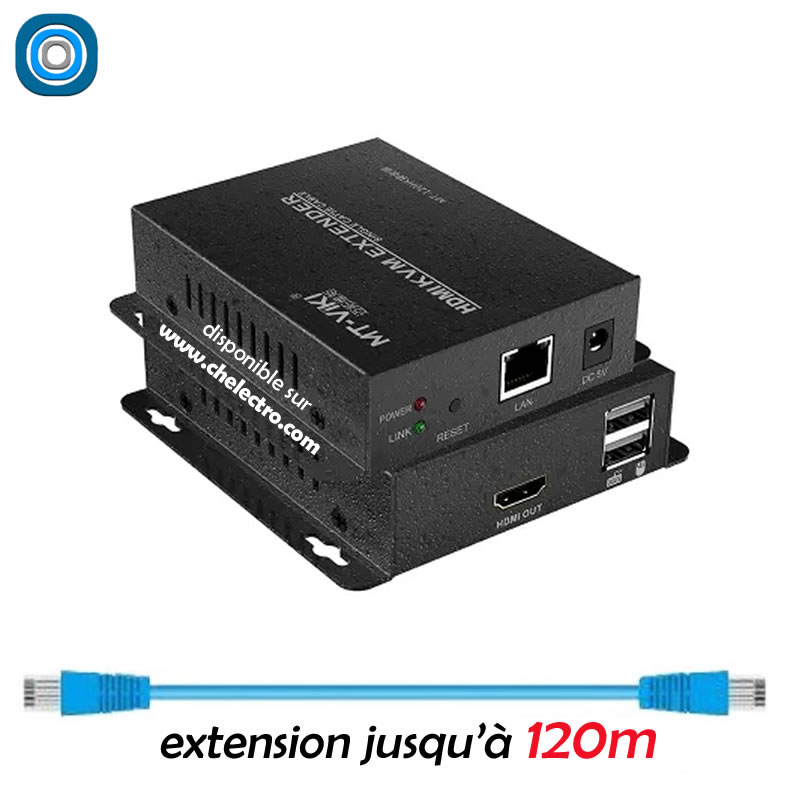 Extendeur KVM HDMI USB par RJ45 alimenté et amplifié. Nécessite un câble Ethernet catégorie 6, jusqu’à 120 mètres.