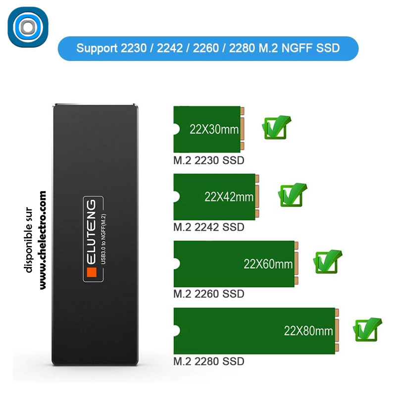 Boîtier externe pour disque dur SSD format M2 NGFF. Compatible avec les tailles 22×30, 22×42, 22×60 et 22×80 M2. Incompatible avec les disques PCIE / NVMe.