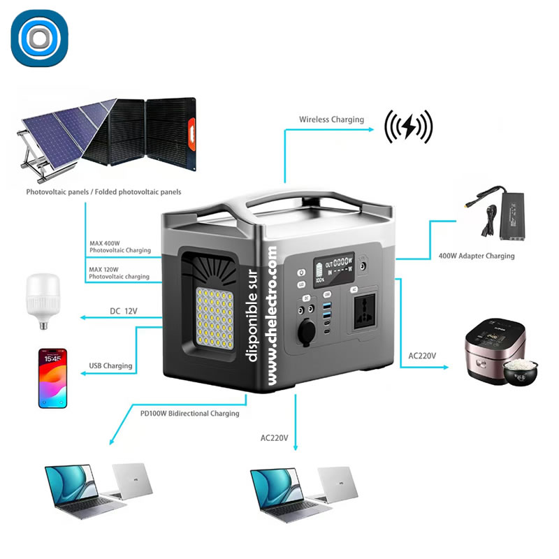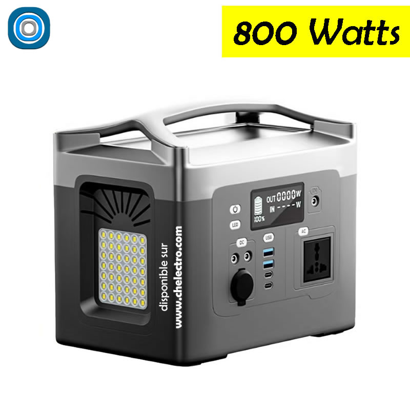 Power bank, générateur électrique portatif, robuste et rechargeable, en plastique solide, design et avec une grande autonomie. Utilisable sur tous les appareils jusqu’à 800 Watts. Rechargeable par énergie solaire ou courant AC 220 / 240 Volts.